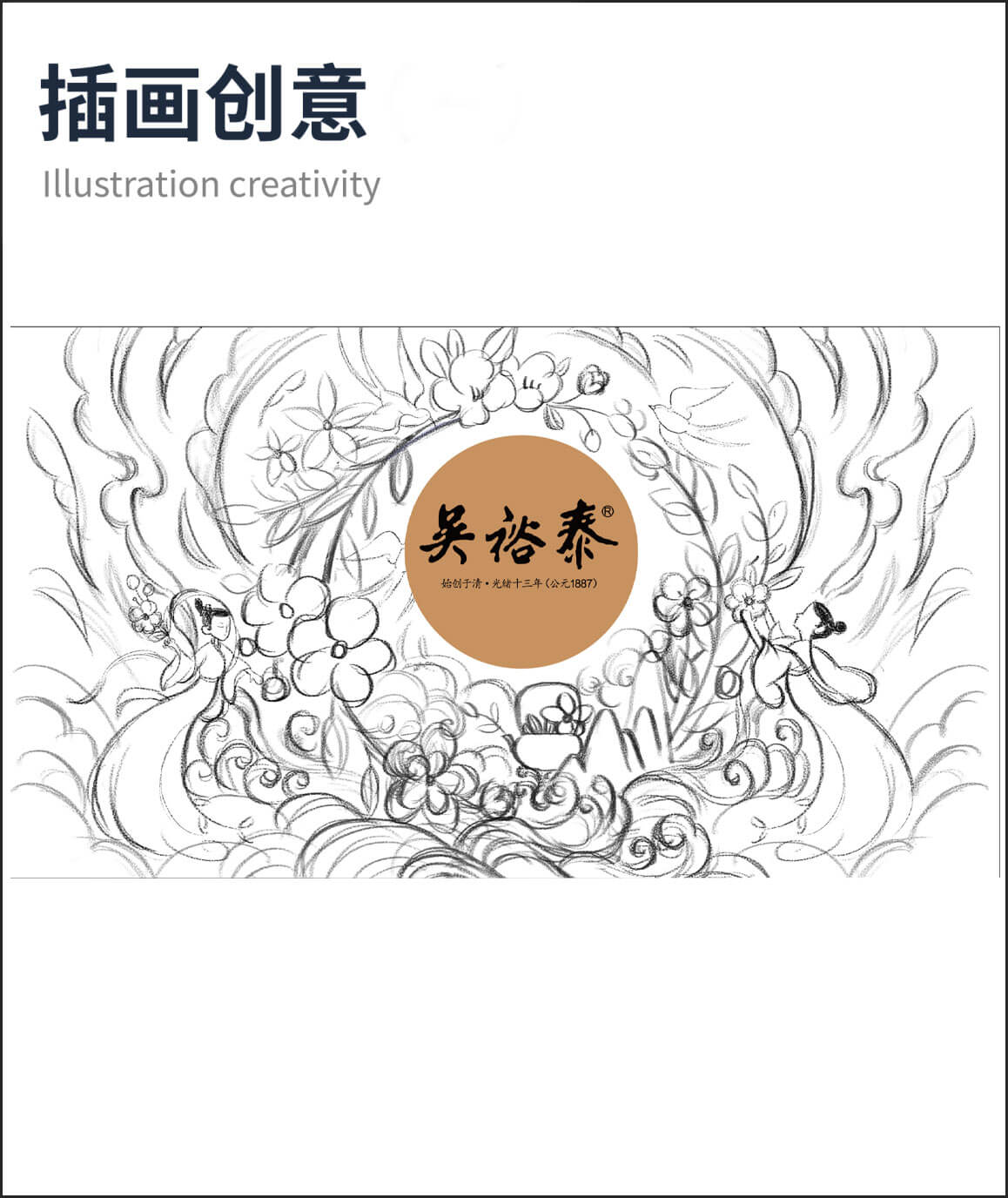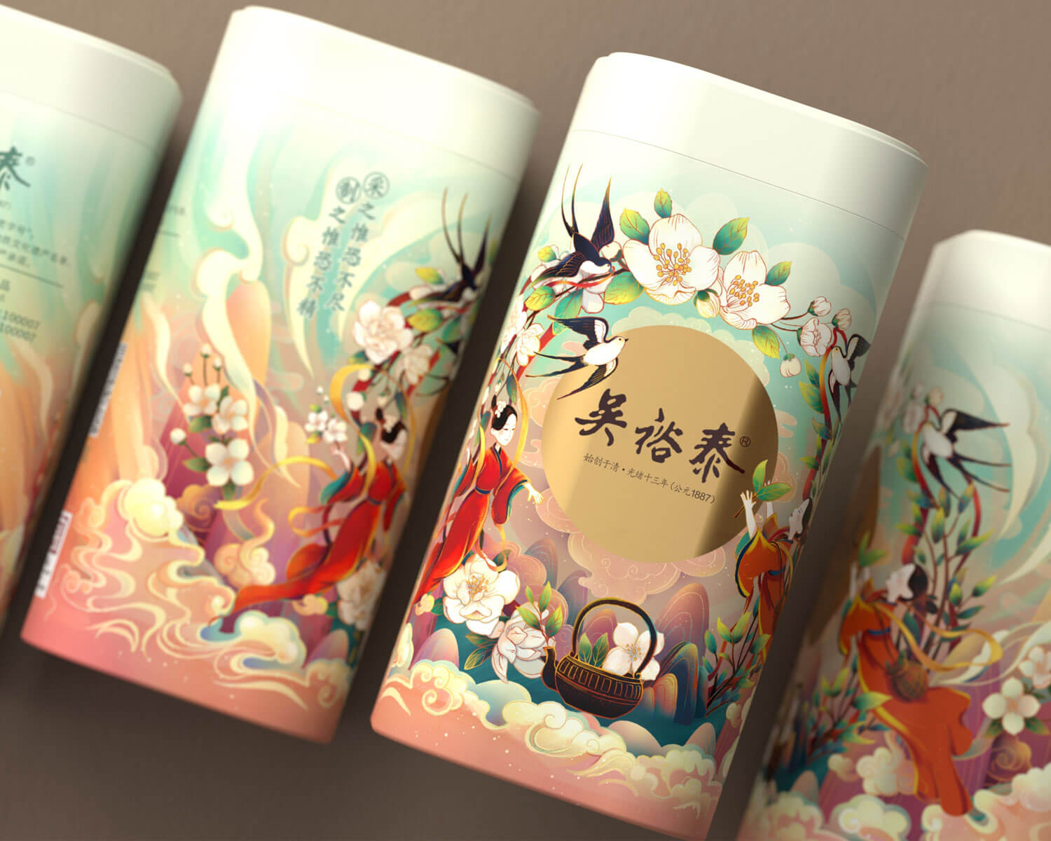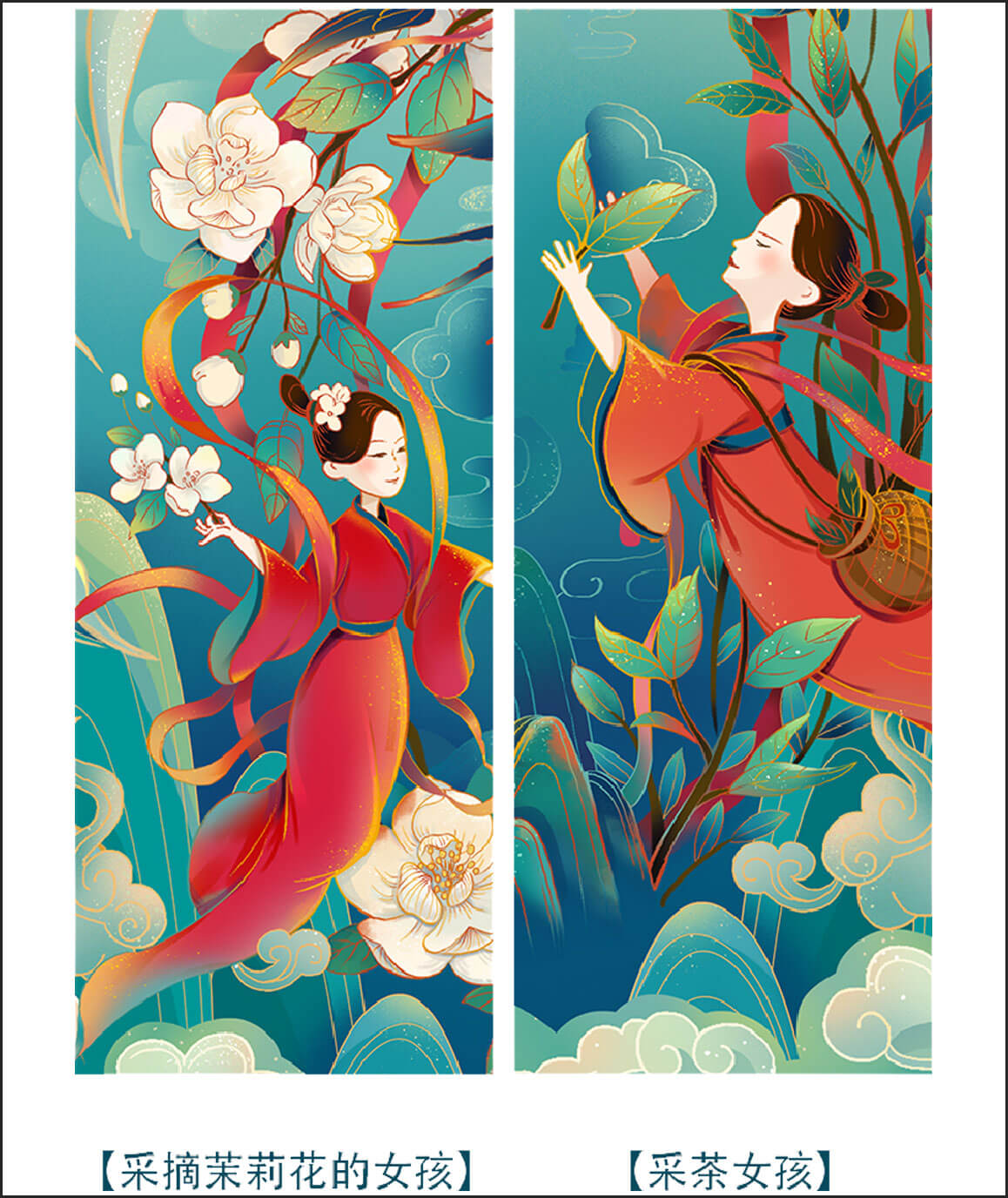 以“茉莉花”為主題元素,進(jìn)行設(shè)計(jì)創(chuàng)作,以國(guó)潮風(fēng)格為基調(diào),輔助山川、流水、茶葉、采茶姑娘、燕子等元素,賦予插畫更多的故事性和閱讀性。