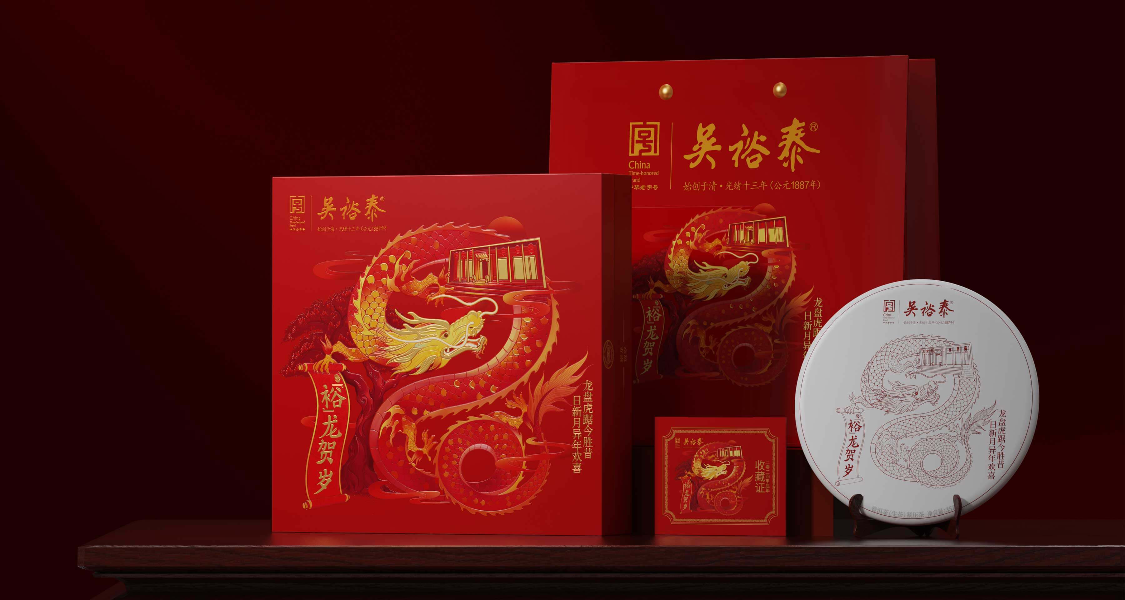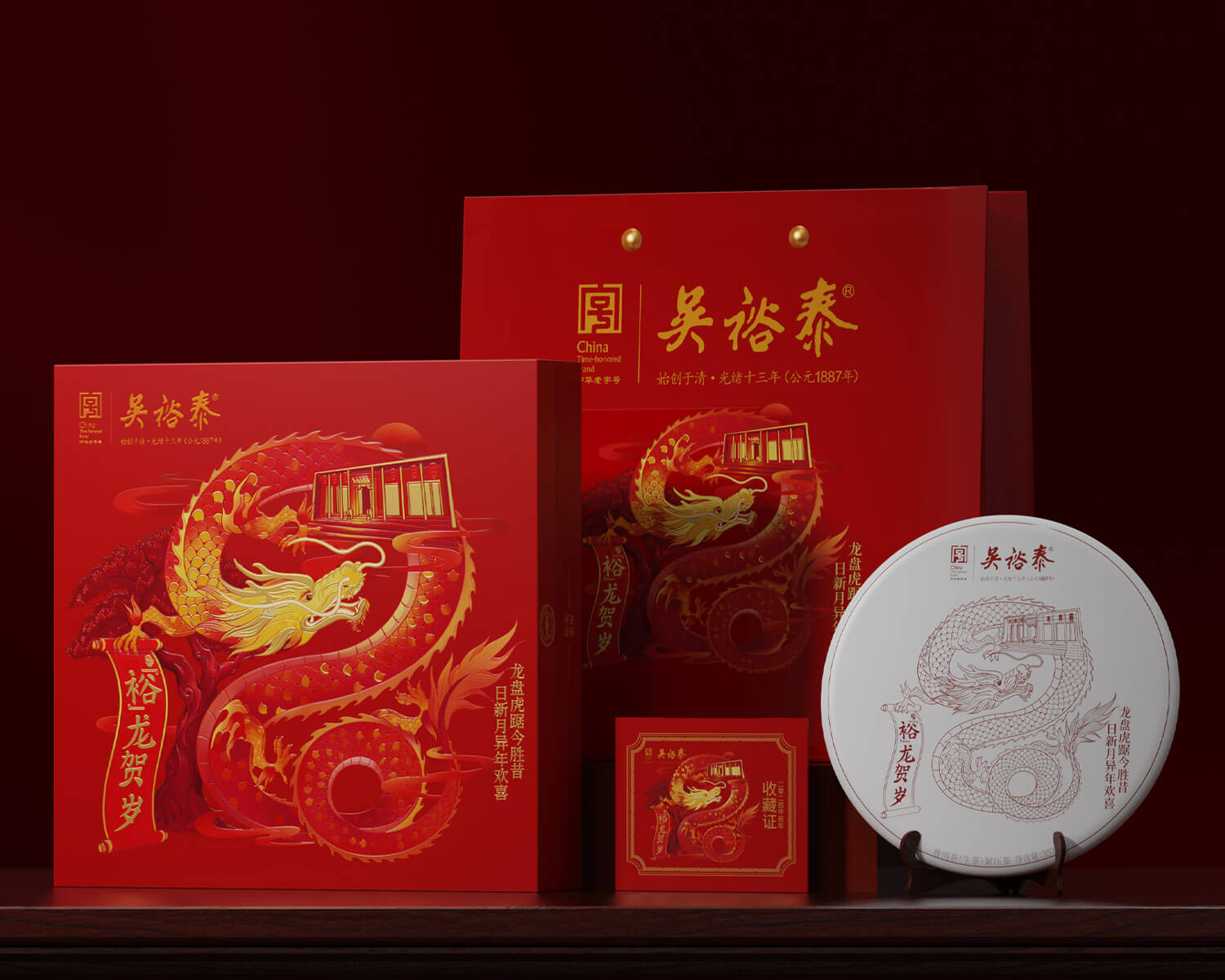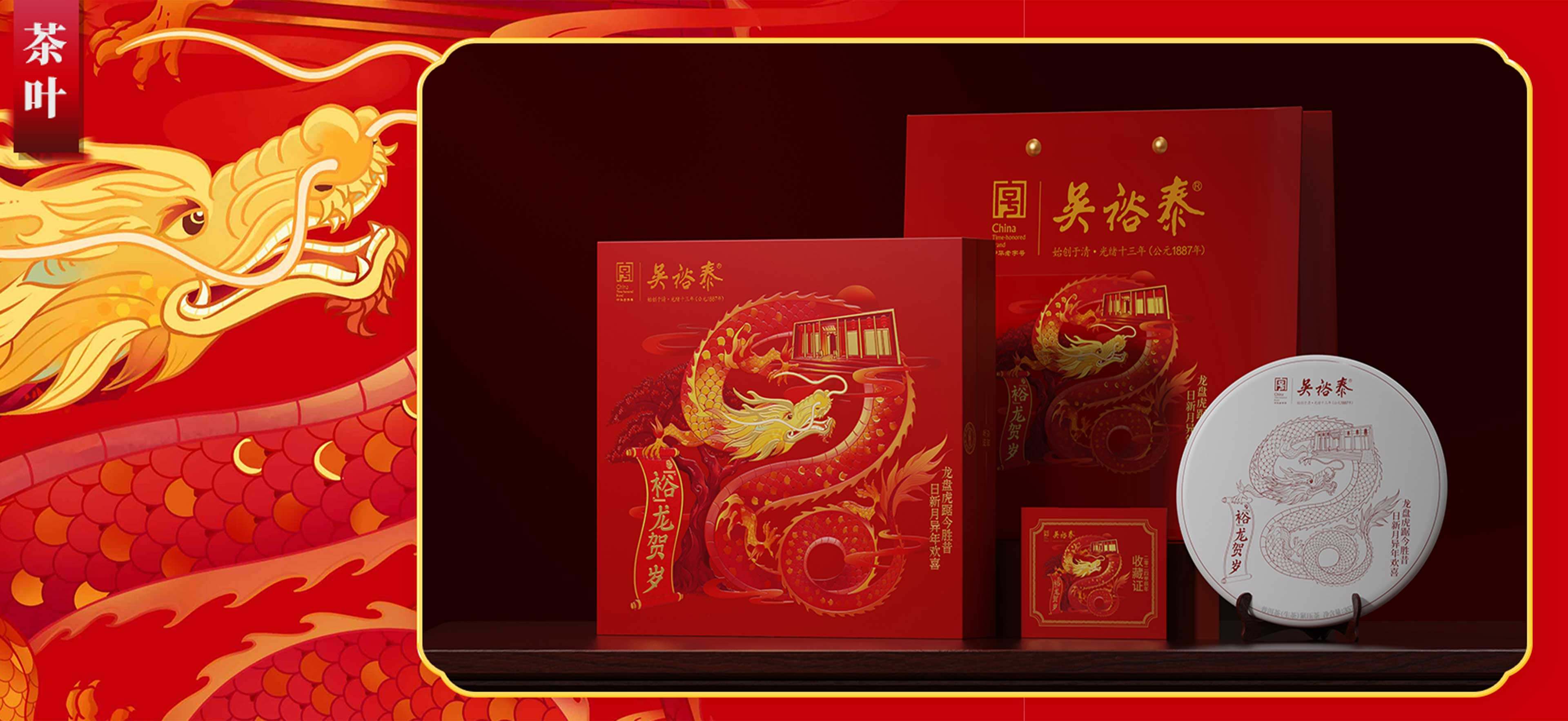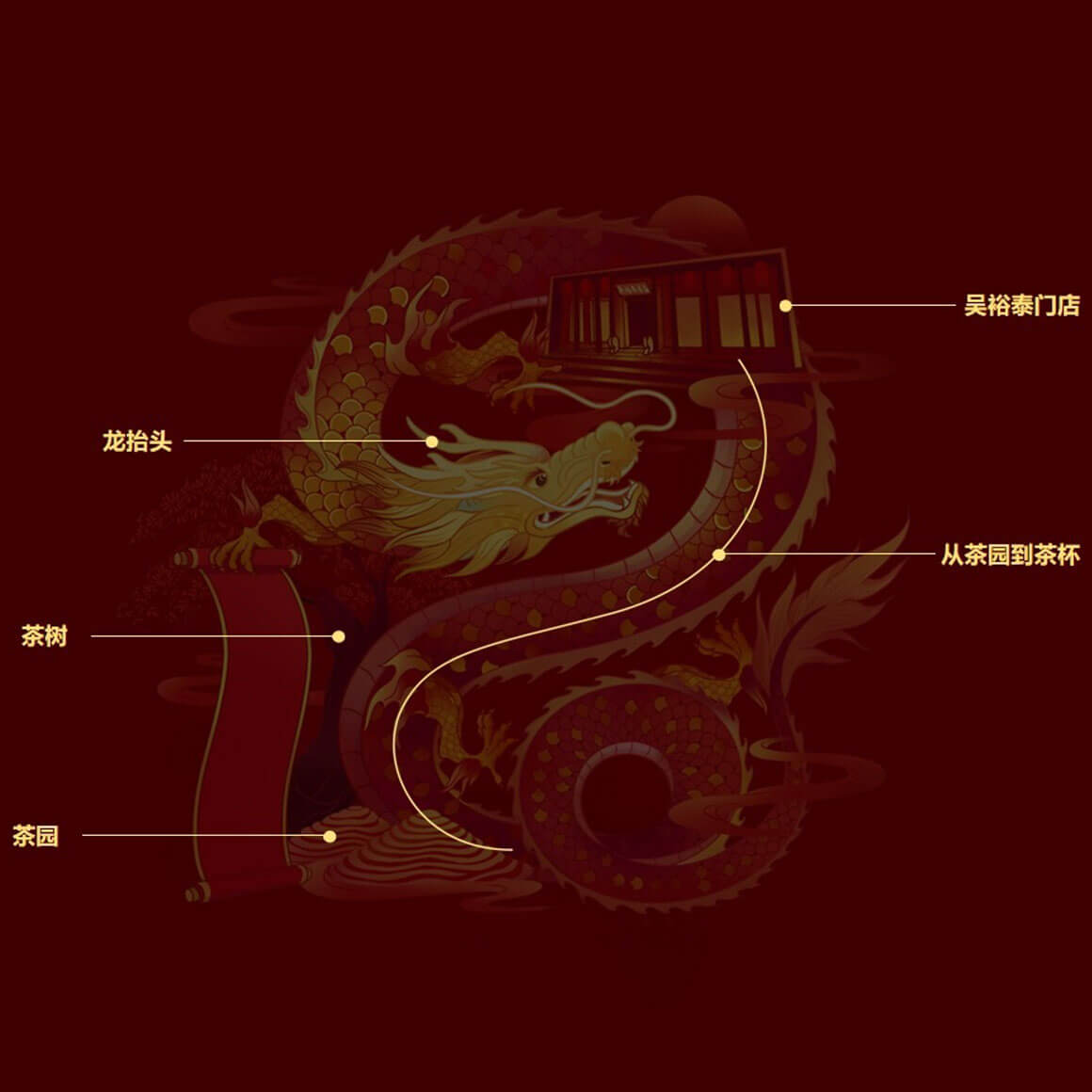 以“裕龍迎春”為主題概念出發(fā),結(jié)合龍?zhí)ь^形態(tài)、吳裕泰門(mén)店+茶園茶樹(shù),體現(xiàn)專屬龍年“從茶園到茶杯”的吳裕泰文化