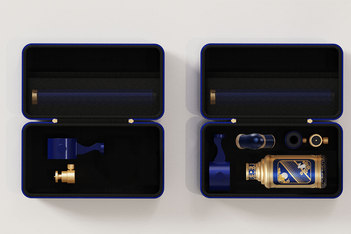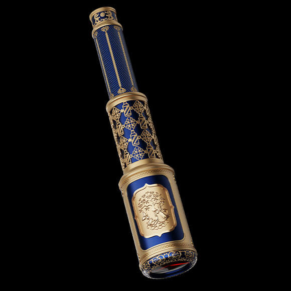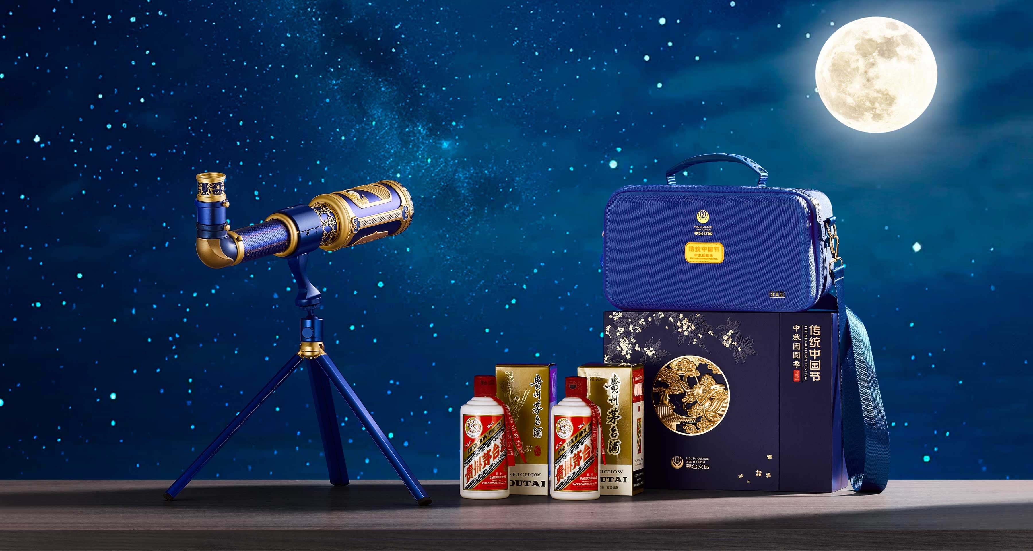 望遠(yuǎn)鏡設(shè)計(jì)靈感源自茅臺(tái)酒瓶型,巧妙融合中秋文化。標(biāo)牌圖案結(jié)合茅臺(tái)經(jīng)典斜線標(biāo)與唐代月宮紋鏡,融合嫦娥、玉兔、桂花、圓月等元素,彰顯茅臺(tái)與中秋的獨(dú)特聯(lián)結(jié)。