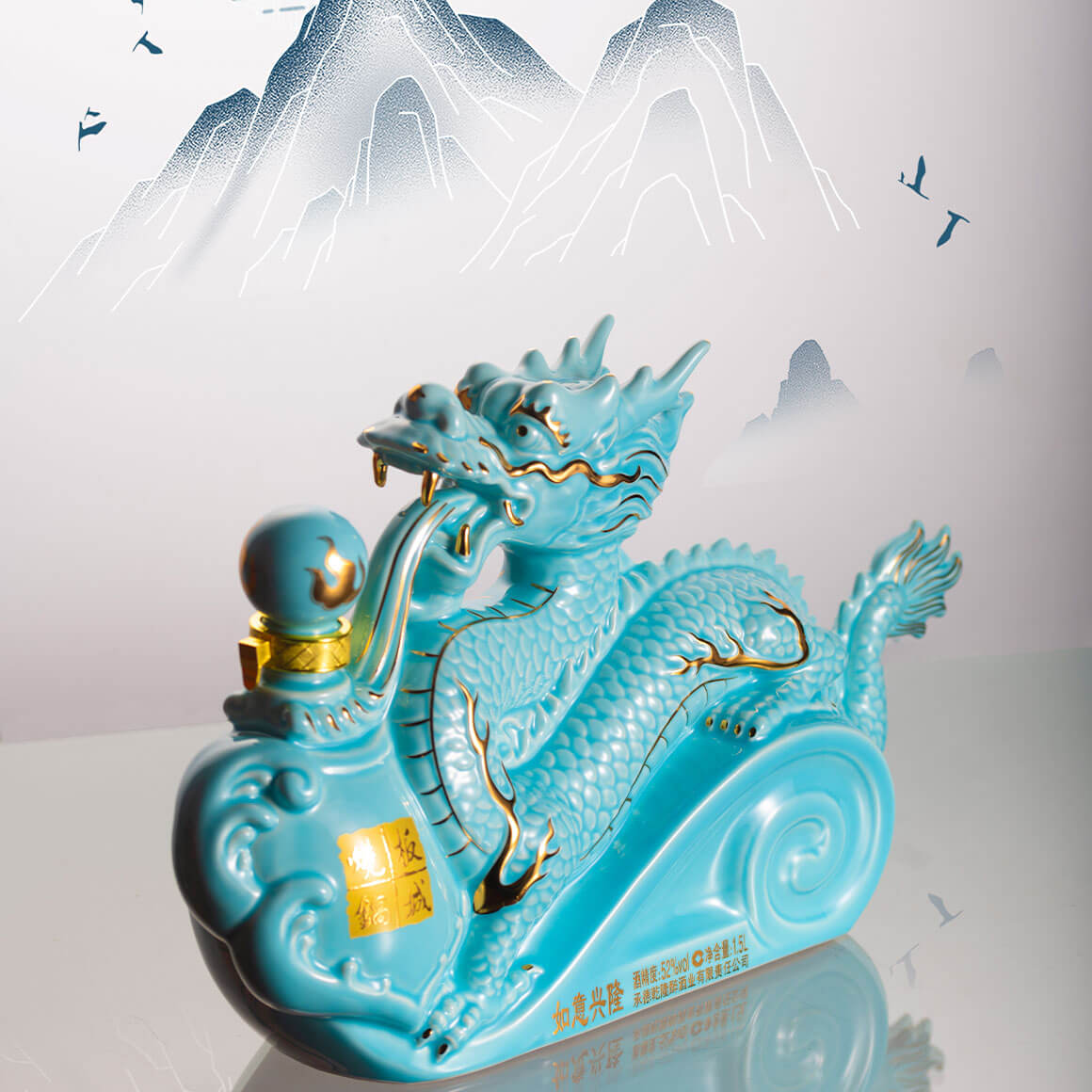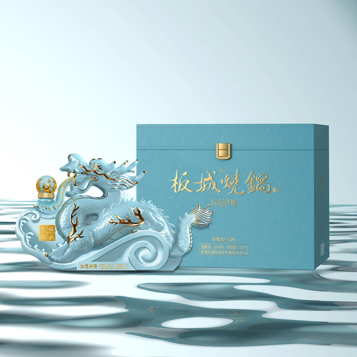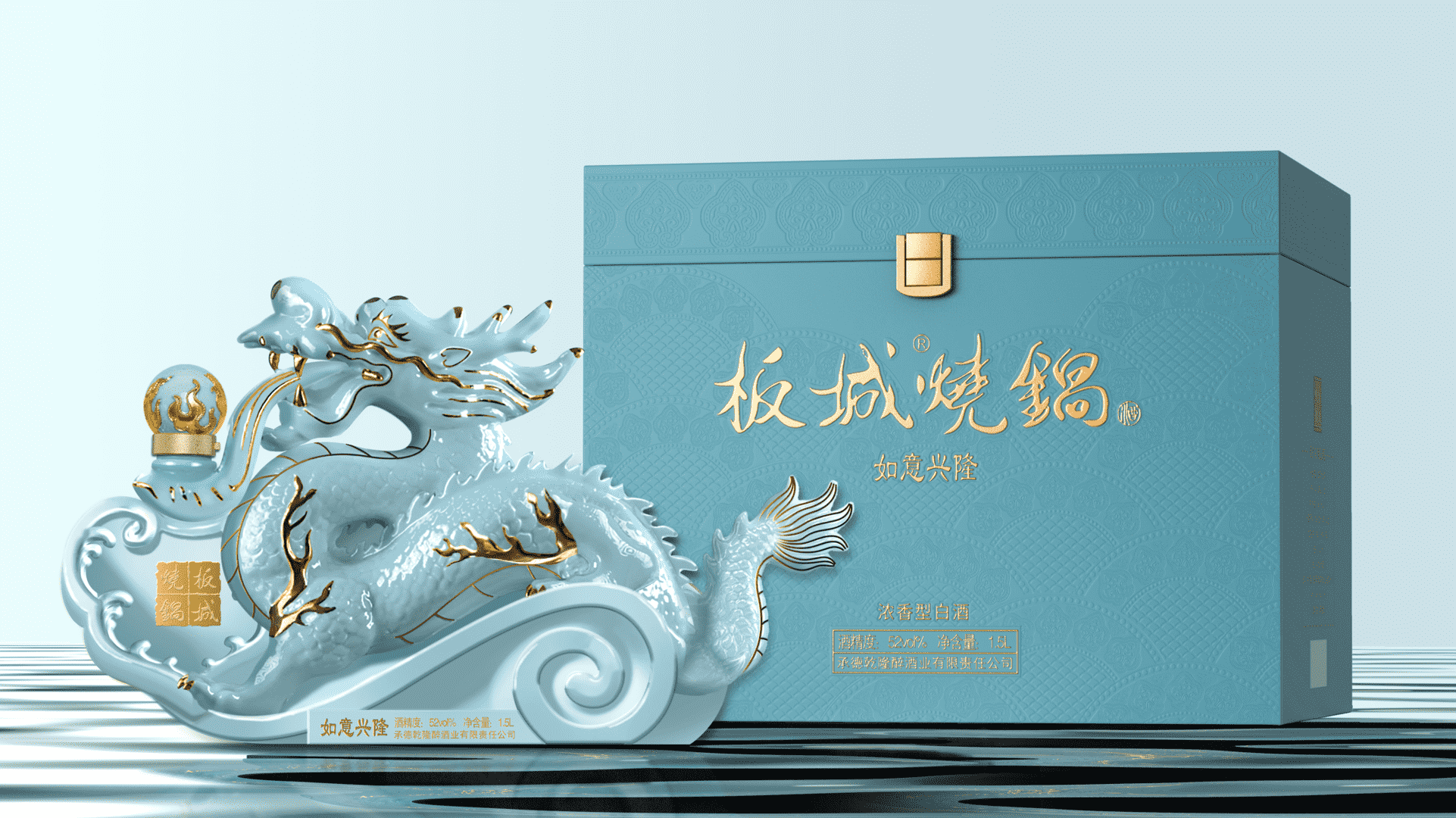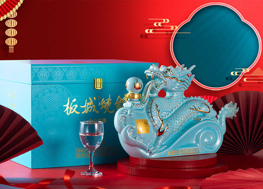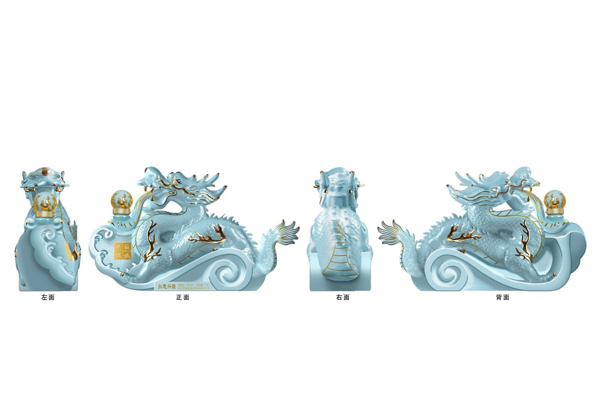 汝窯天青色+雅金純凈柔和的天青色+典雅的金色,以珍貴的汝窯天青色來塑造板城龍年生肖酒的珍貴性,收藏性。