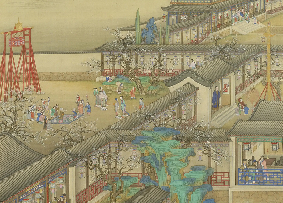 《雍正十二月行樂(lè)圖》軸之《五月競(jìng)舟》此圖描繪的是五月端午時(shí)節(jié),皇家歡度端午節(jié)的情景。圖中雍正皇帝身著漢裝,與眾皇妃、皇子歡坐于碼頭樓閣之上,數(shù)艘華麗的宮廷龍舟馳騁于水面之上。整幅畫面洋溢著歡樂(lè)祥和的氣氛。