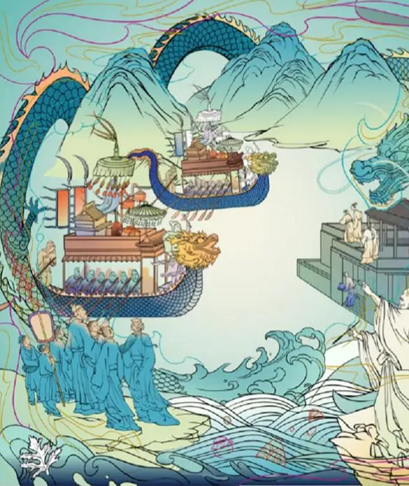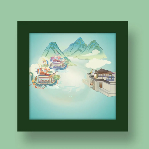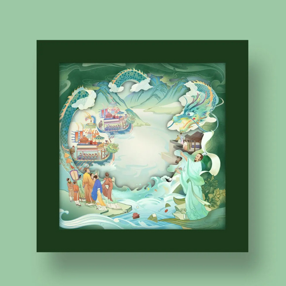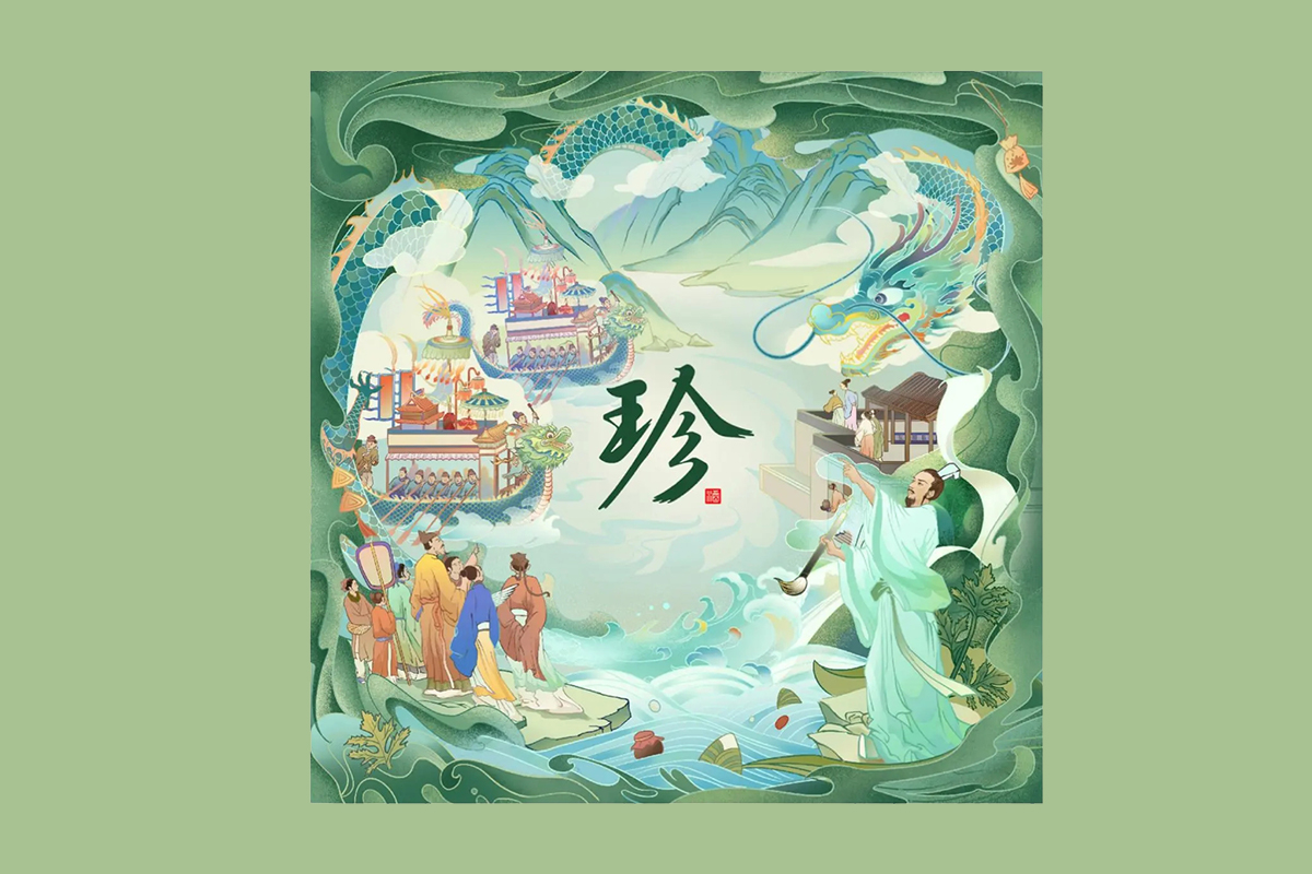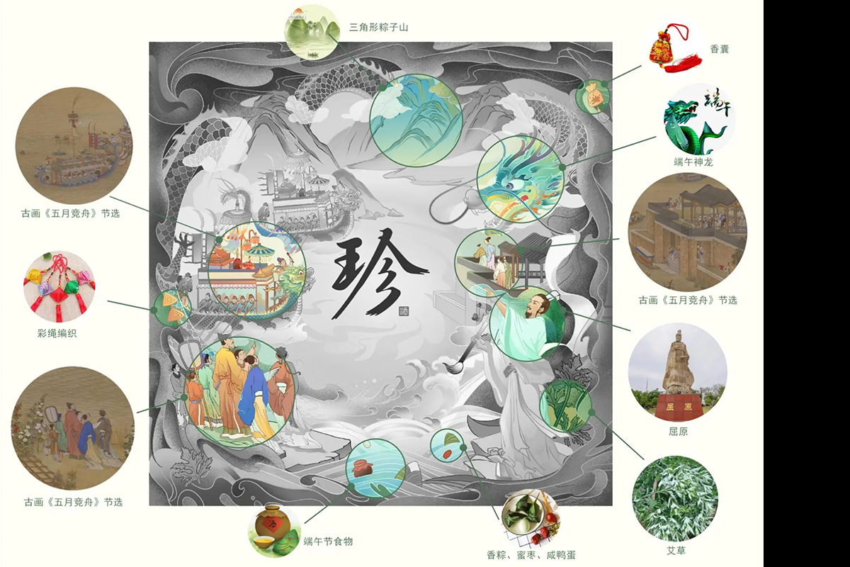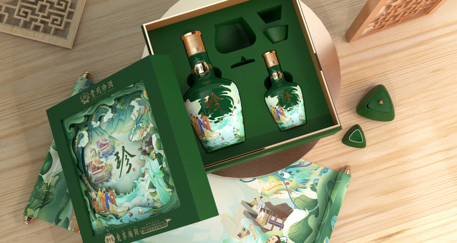 珍酒端午文創(chuàng)以屈原手執(zhí)畫筆描繪端午競(jìng)舟為創(chuàng)意,結(jié)合《五月競(jìng)舟》部分畫面, 重現(xiàn)端午競(jìng)舟畫面,體現(xiàn)歡樂(lè)祥和的節(jié)日氣氛。