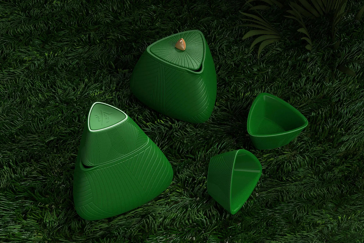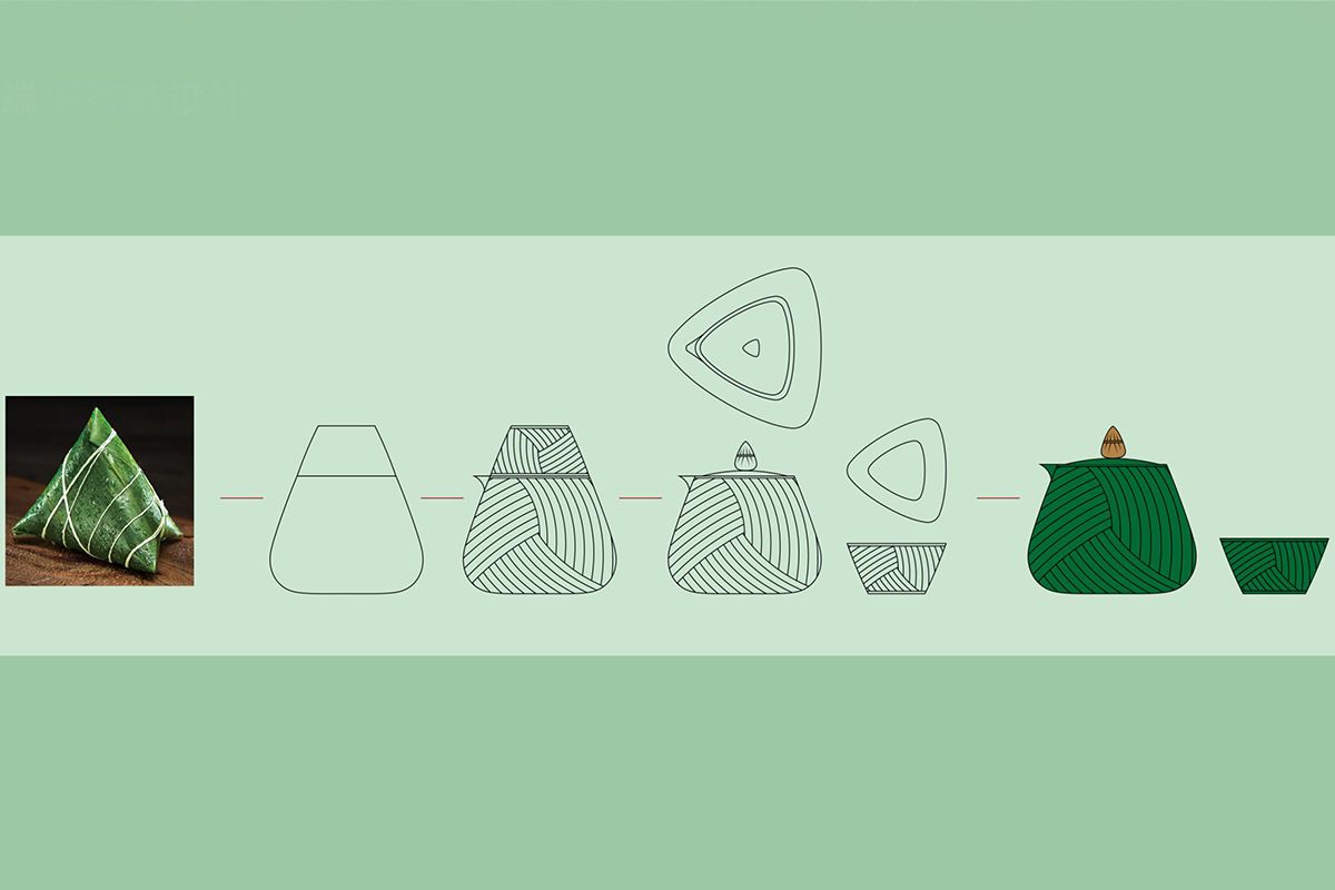 端午茶具造型以粽子為原型,茶壺與茶杯組合的外形一例飽滿的粽子,外形增加弧度減少棱角感,茶具外壁增加粽葉紋理使產(chǎn)品更具端午吃粽子的氛圍