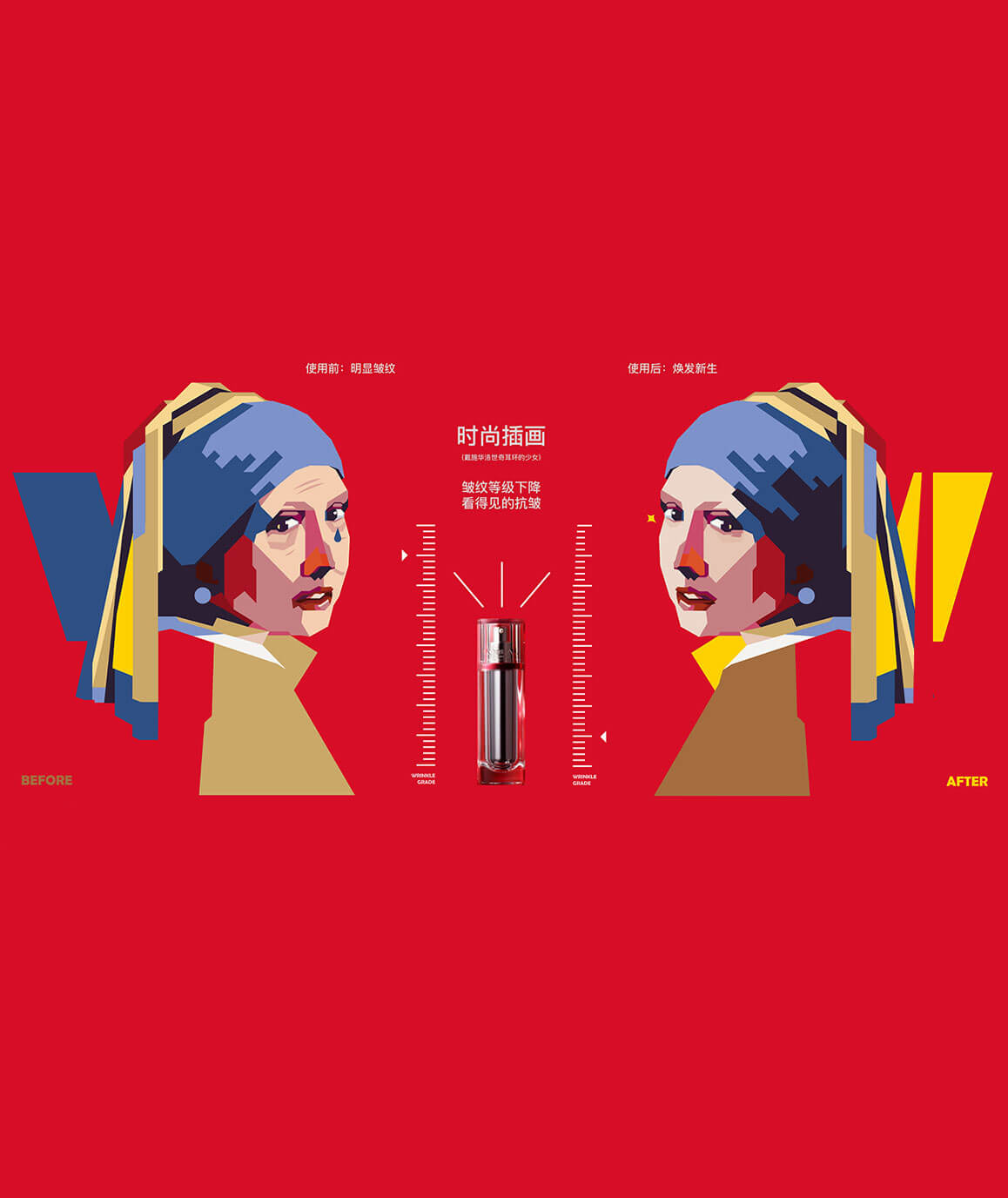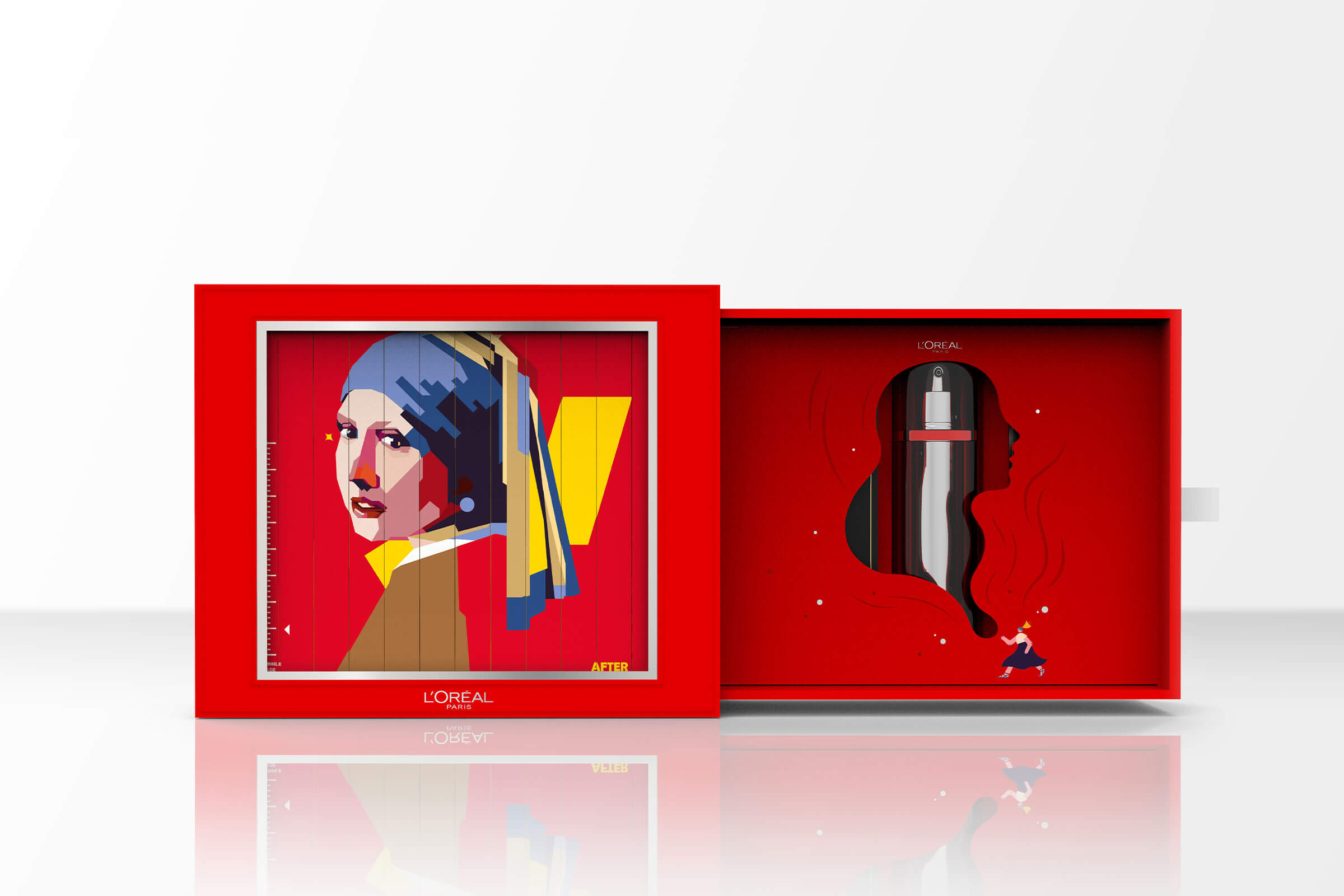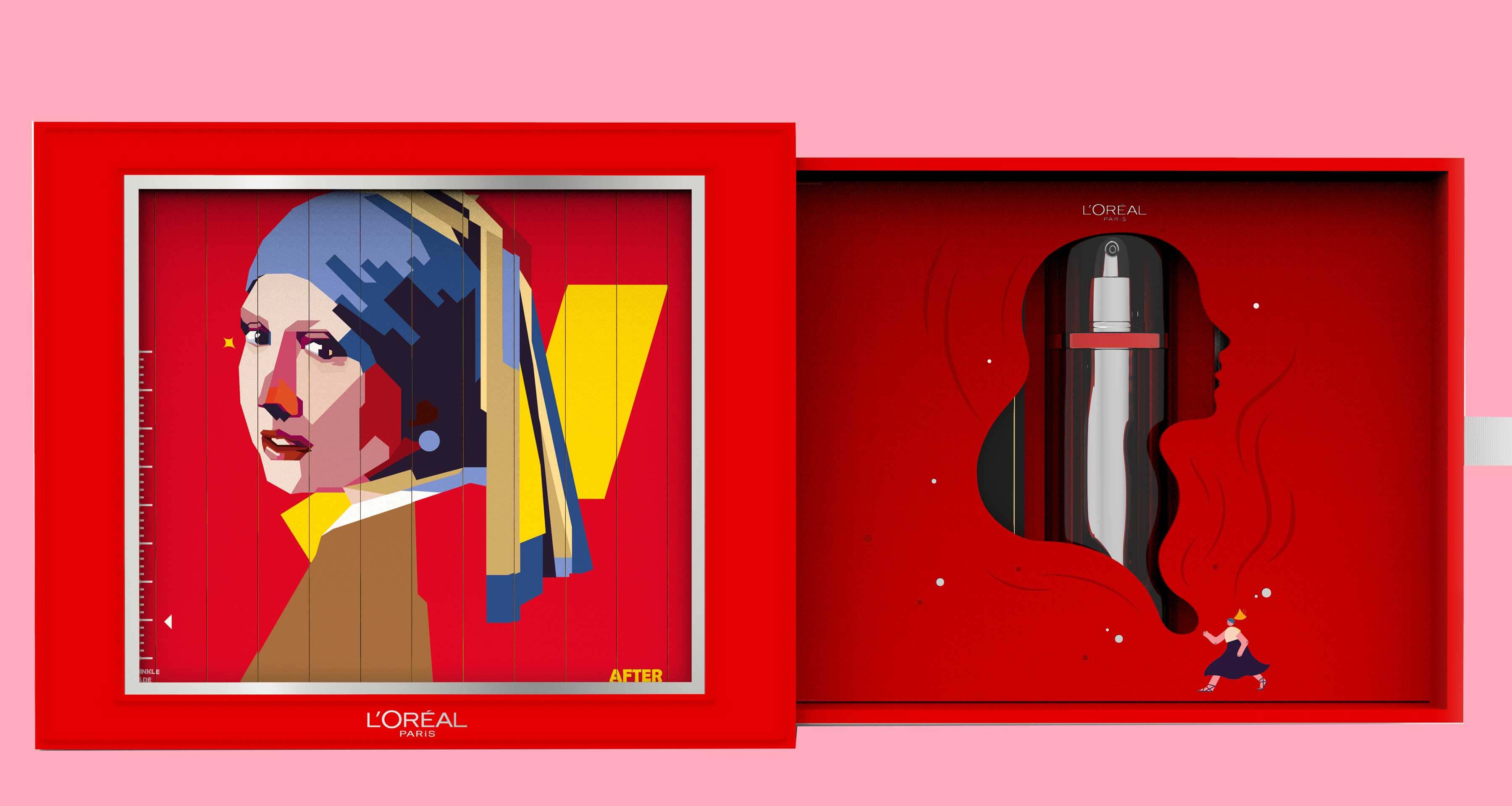 我們使用了相框盒型并在外盒制作了一個靜置時被皺紋困擾,而拉出產(chǎn)品后皺紋瞬間消失的少女形象裝置,表現(xiàn)使用產(chǎn)品前后的直觀對比,內(nèi)盒抽出帶動小人拉走皺紋表現(xiàn)出“看得見的抗皺和“多維度抗皺”的產(chǎn)品特點,希望這一款互動裝置能直觀表現(xiàn)出產(chǎn)品使用前后祛皺逆齡奇跡功效,為消費者帶來一個最直接有趣的抗皺體驗。