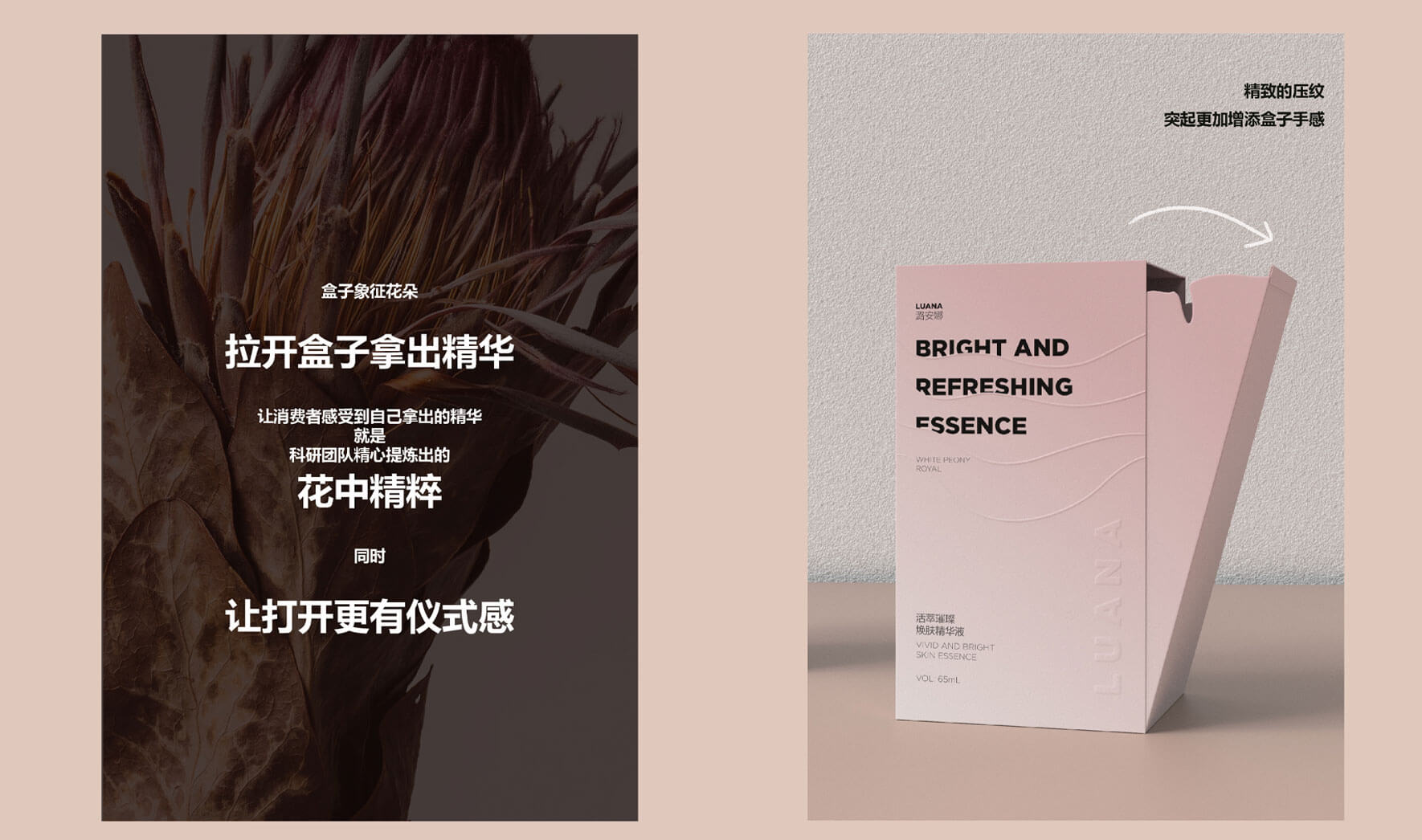 盒子象征花朵拉開盒子拿出精華,讓消費者感受到自己拿出的精華,就是科研團(tuán)隊精心提煉出的花中精粹,同時讓打開更有儀式感,精致的壓紋凸起更加增添盒子手感。