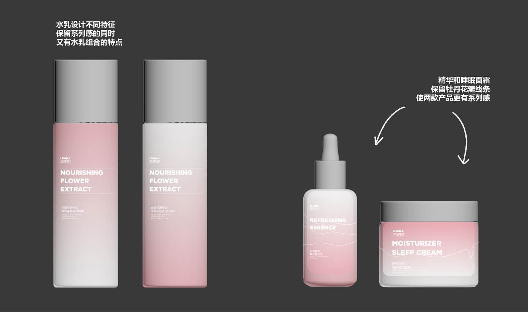 潞安娜主打產(chǎn)品精華和乳液,時尚簡約磨砂質(zhì)感更顯高級。水乳設(shè)計不同特征,保留系列感的同時,又有水乳組合的特點。精華和睡眠面霜,保留牡丹花瓣線條,使兩款產(chǎn)品更加有系列感。
