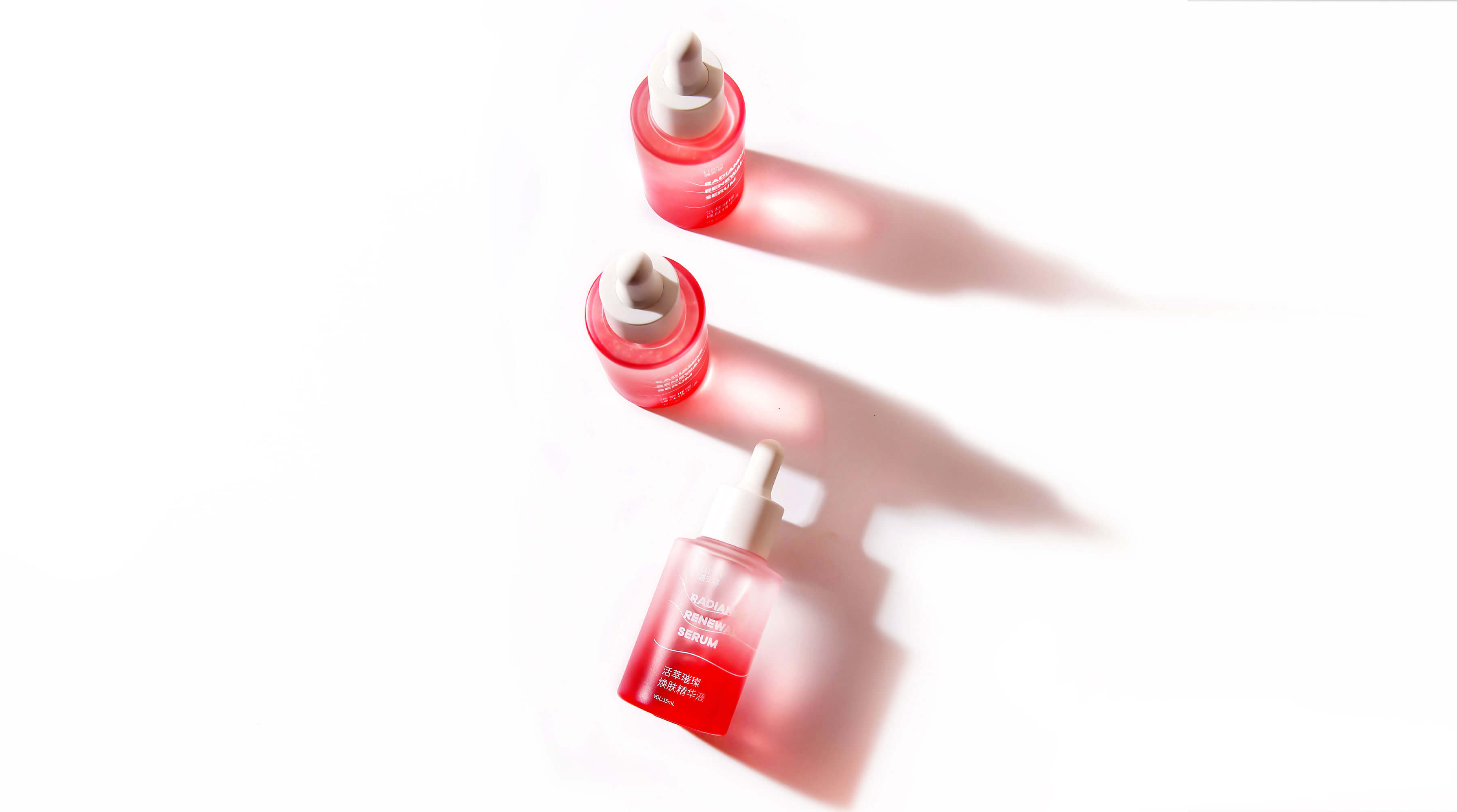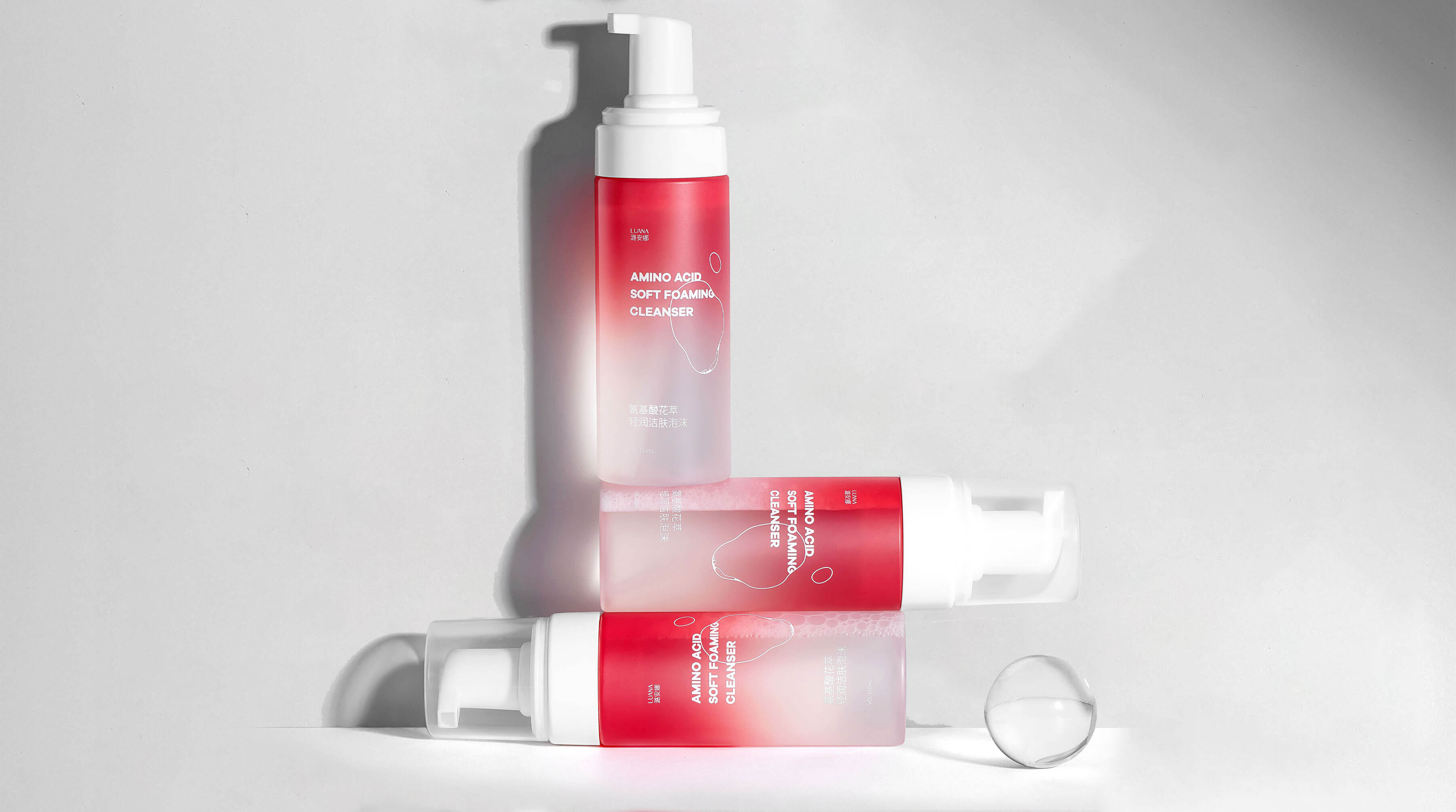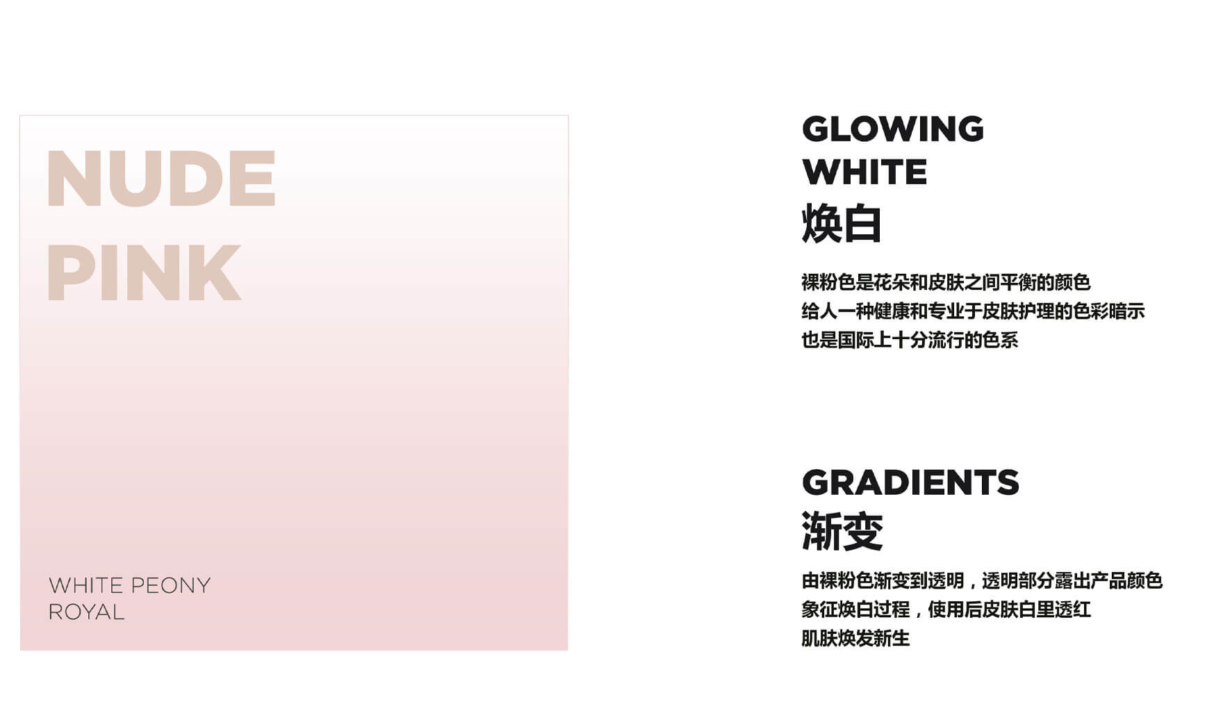 裸粉色是花朵和皮膚之間平衡的顏色,也是國際上十分流行的色系,給人一種健康和專業(yè)于皮膚護(hù)理的色彩暗示。由裸粉色漸變到透明,透明部分露出產(chǎn)品顏色象征煥白過程,使用后皮膚白里透紅肌膚煥發(fā)新生。