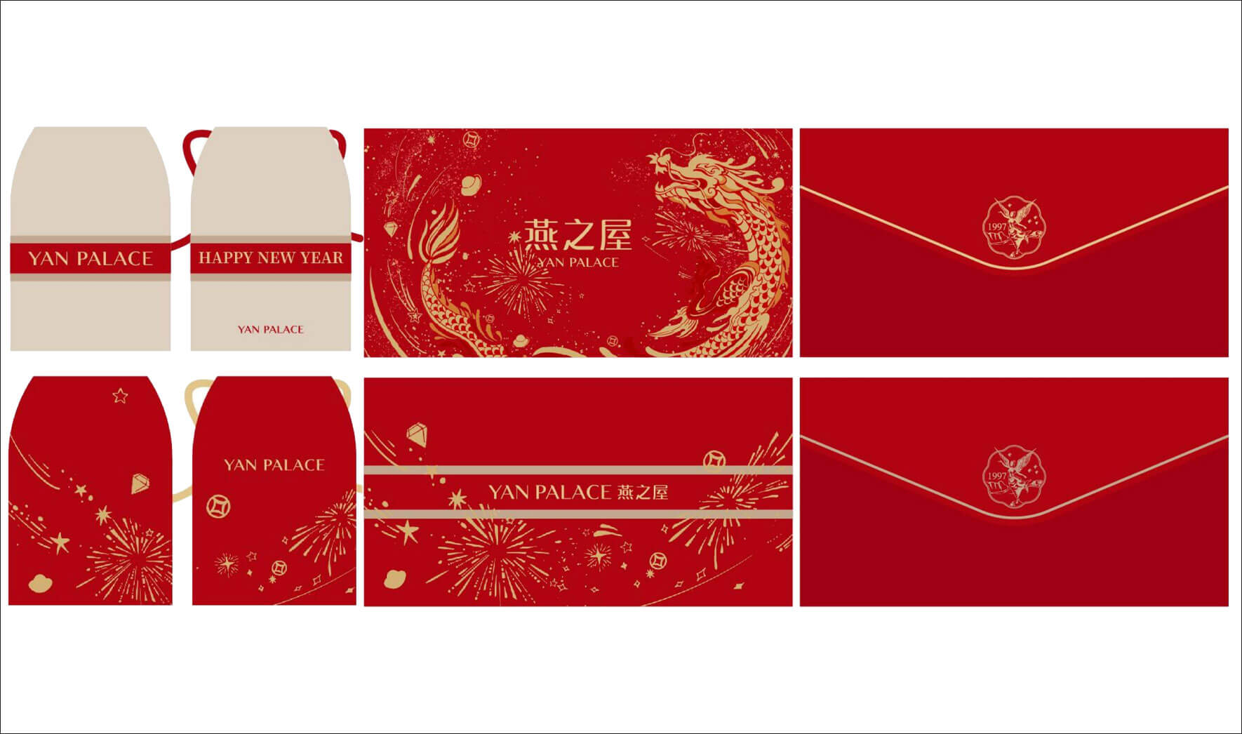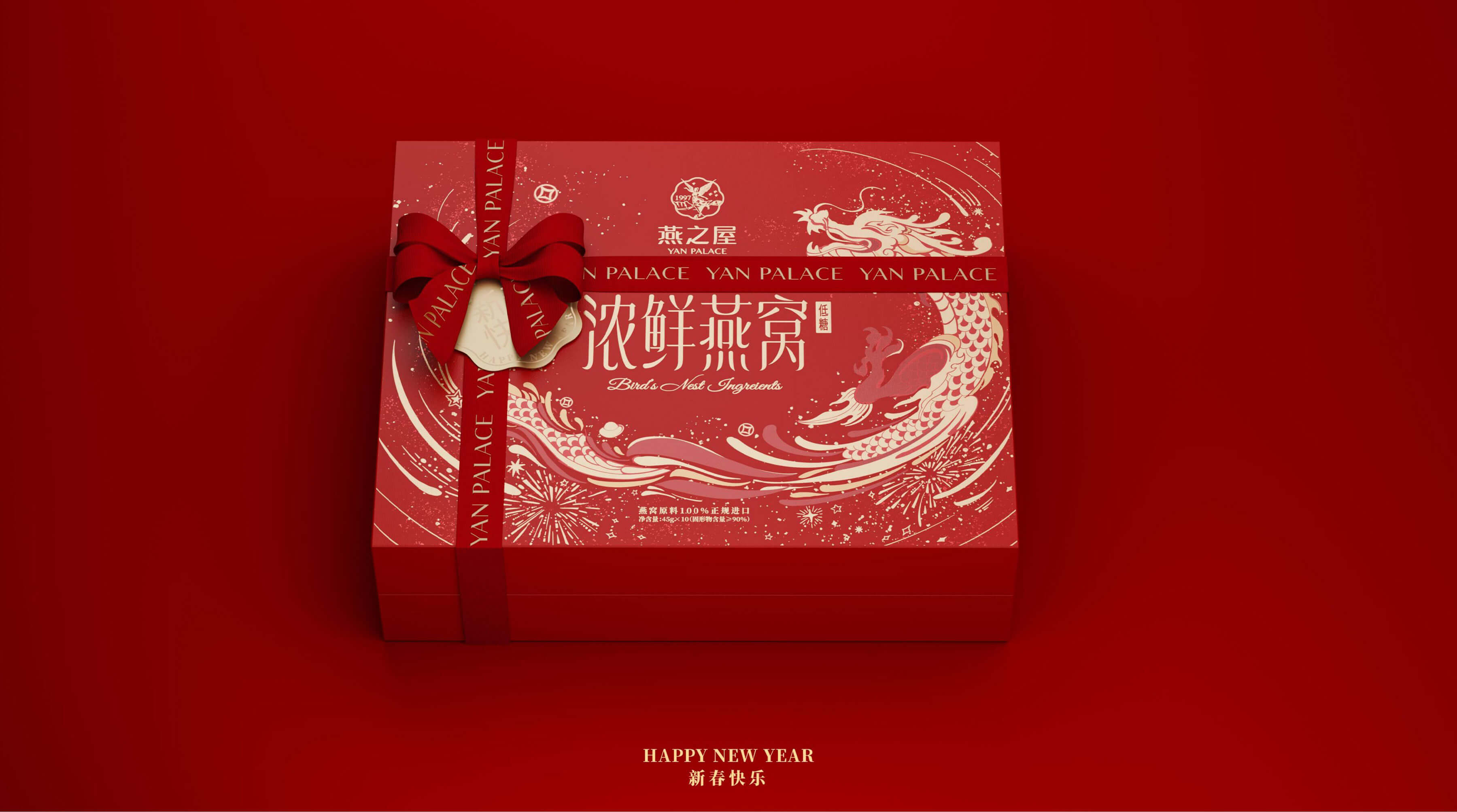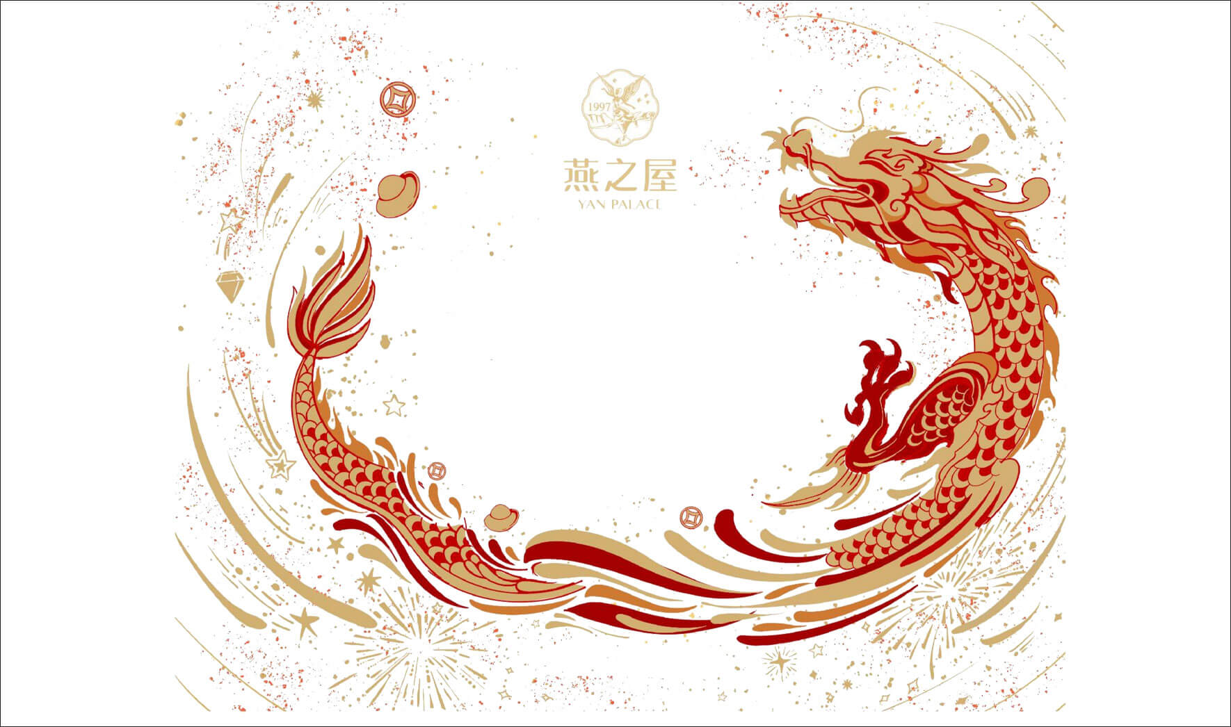 龍的形象采用手繪插畫形式表現(xiàn),結(jié)合新年的熱鬧元素,構(gòu)成一幅喜氣洋洋的場景,中間圍繞著品牌,寓意將福氣與祥瑞送予燕之屋,同時將這一份東方的鮮禮--濃鮮燕窩代表的情意濃濃傳遞給尊貴的客戶。