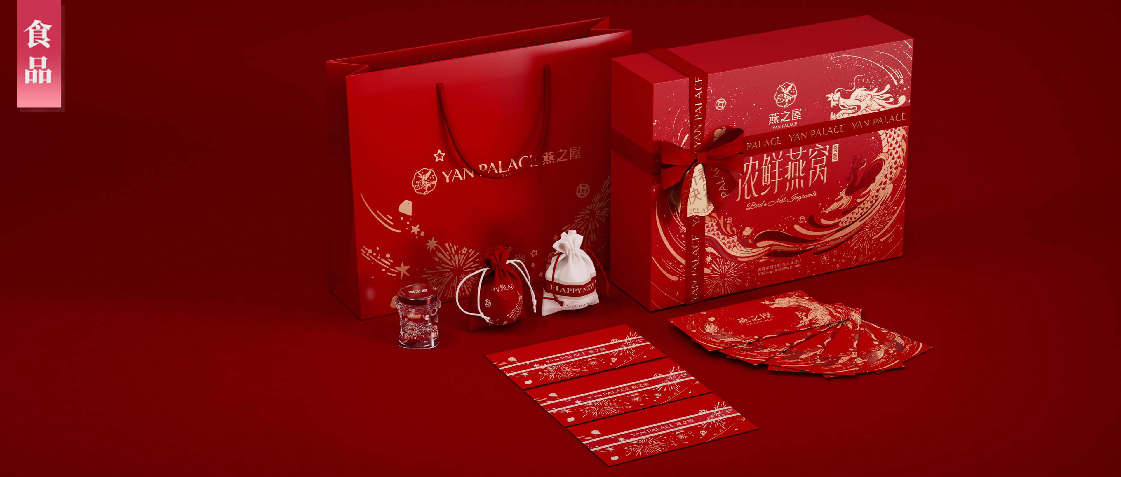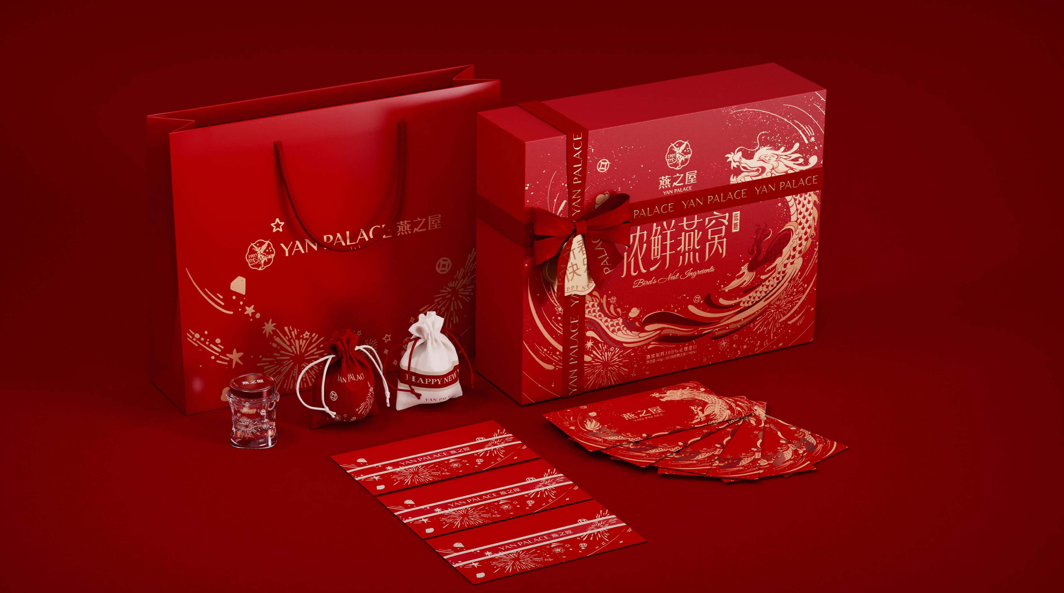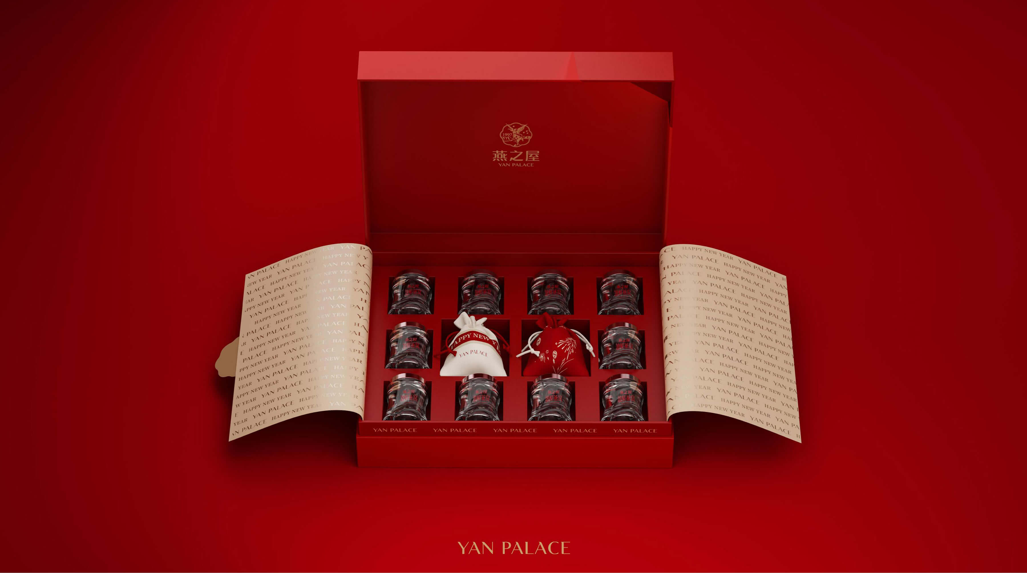 龍的形象采用手繪插畫形式表現(xiàn),結(jié)合新年的熱鬧元素,構(gòu)成一幅喜氣洋洋的場景,中間圍繞著品牌,寓意將福氣與祥瑞送予燕之屋,同時將這一份東方的鮮禮--濃鮮燕窩代表的情意濃濃傳遞給尊貴的客戶。