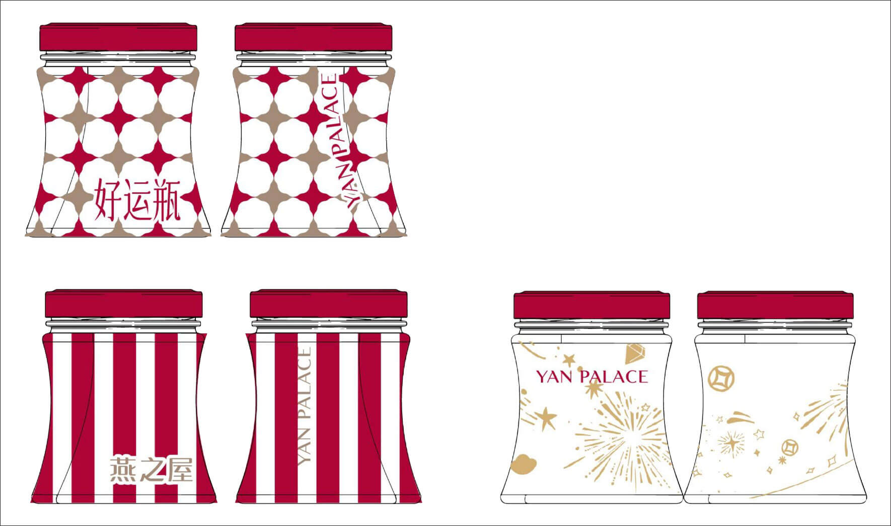 外盒采用原有濃鮮燕窩書本盒型,內(nèi)部結(jié)構(gòu)采用規(guī)矩的擺放方式兩個福袋內(nèi)放置漂流瓶,寓意“納福納財,福氣滿滿”。