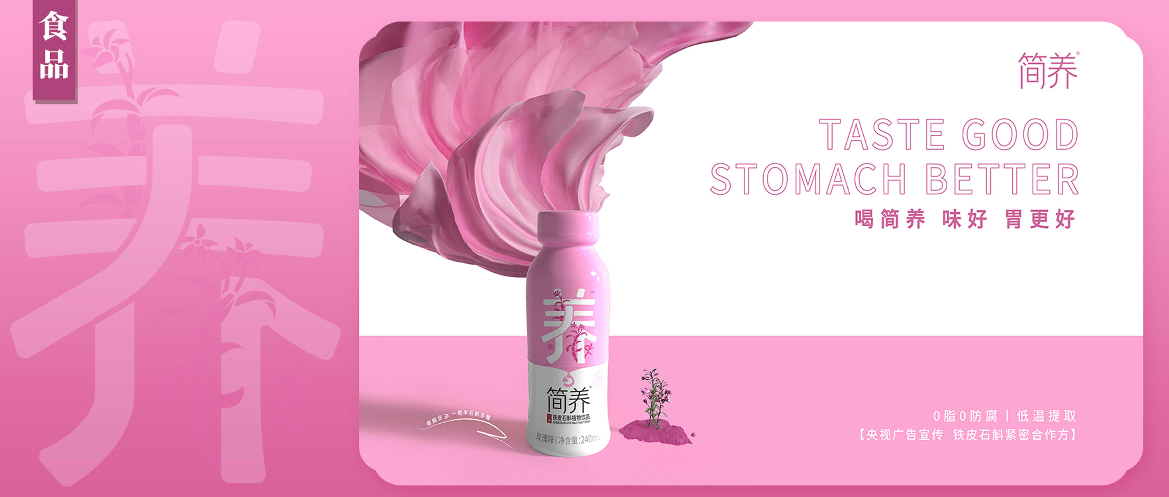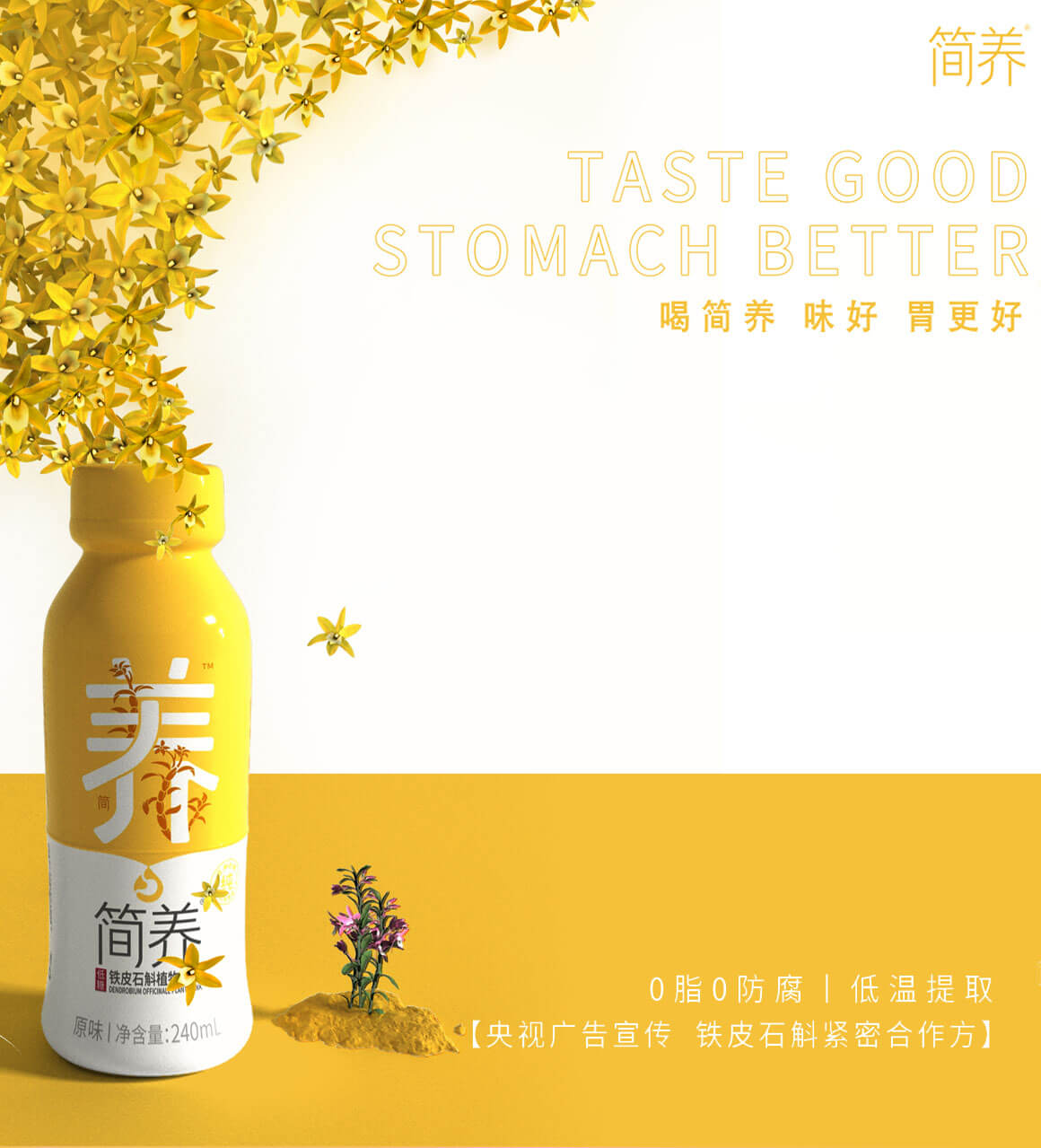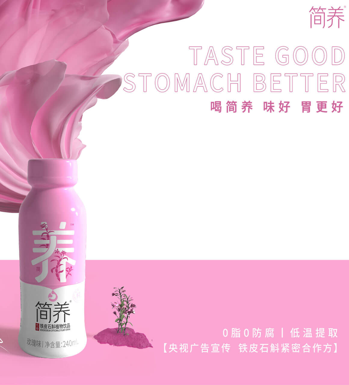 在產(chǎn)品設計構思上我們以畫面中心為分割線,一口“簡養(yǎng)”飲品持續(xù)養(yǎng)護你的“胃”,飲品也在分割處剛好滴落下來,有一種溢出來的視覺感受。